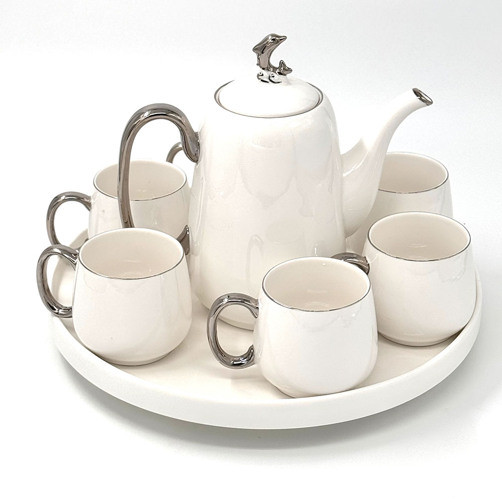 Featuring an elegant white bone china design with silver trimming, this 8-piece tea set is a beautiful addition to any luxury dining sets collection. A timeless piece that exudes sophistication.